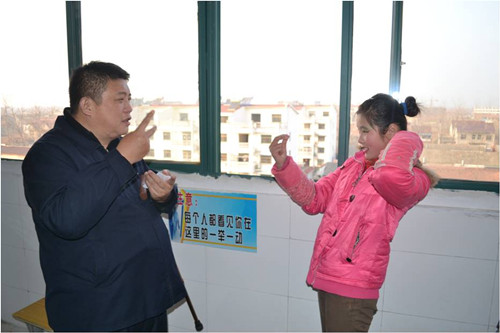 圖為李靜董事長與聾啞人同學用手語交流