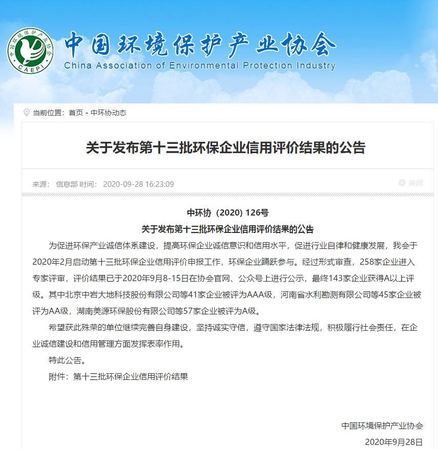 中水三立成功獲批第十三批中國環(huán)保企業(yè)AAA信用等級企業(yè)