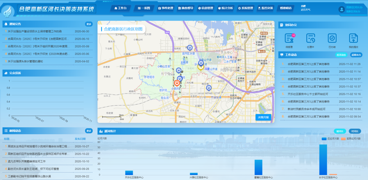 系統(tǒng)建成運(yùn)行5個(gè)月以來,用戶體系覆蓋合肥市高新區(qū)各級(jí)河長、成員單位、河道警長100余人,巡河次數(shù)達(dá)8000余次,里程達(dá)1600多公里,巡河總時(shí)長12000多分鐘,上報(bào)事件187件,事件辦結(jié)率80%以上,接入零直排監(jiān)控、水域岸線監(jiān)控和水質(zhì)斷面監(jiān)測(cè)站點(diǎn),獲取實(shí)時(shí)監(jiān)測(cè)數(shù)據(jù)約40000條。