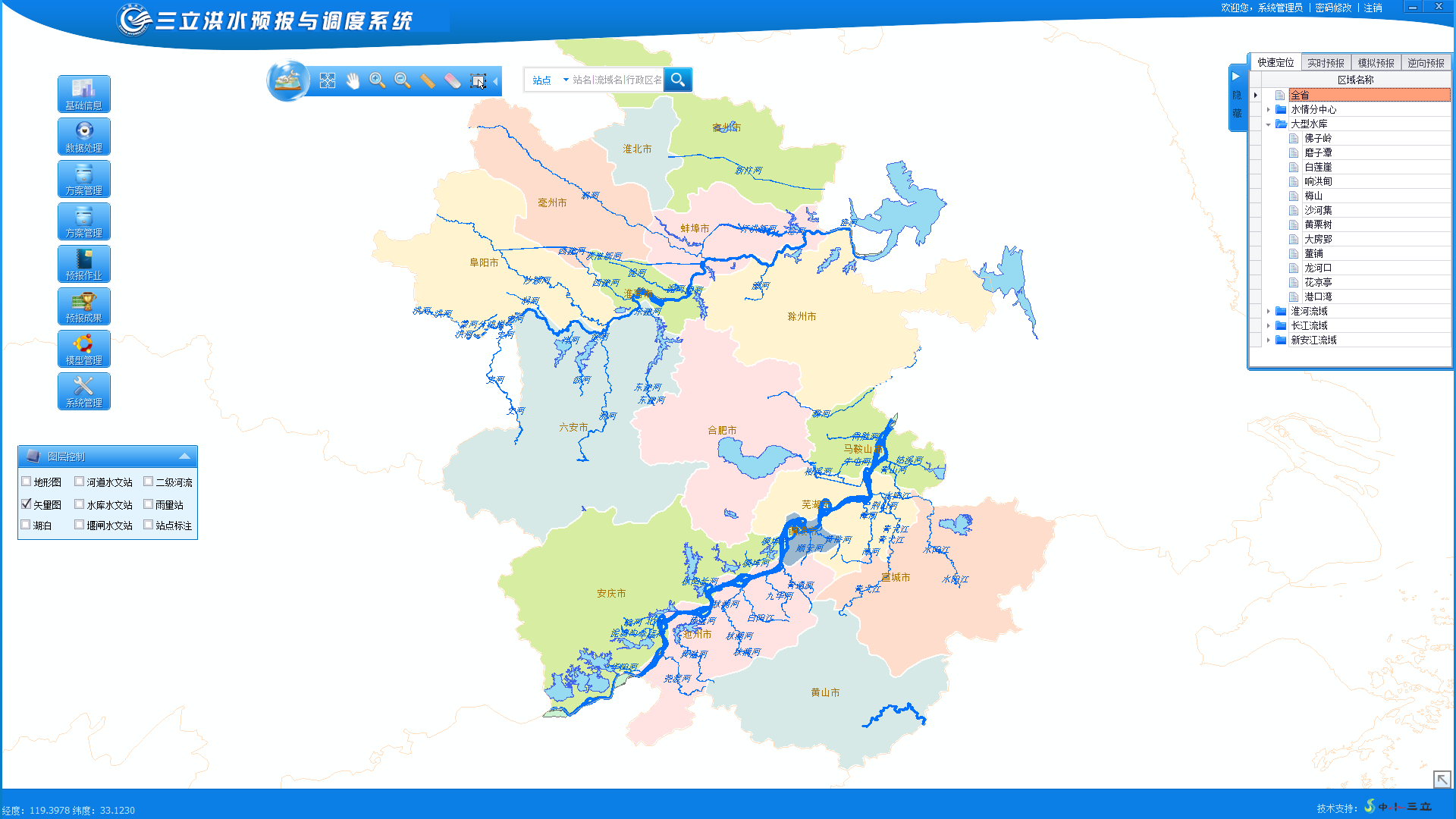中水三立洪水預(yù)報(bào)與調(diào)度系統(tǒng)從基礎(chǔ)信息管理、方案構(gòu)建、預(yù)報(bào)作業(yè)、成果管理等幾大業(yè)務(wù)進(jìn)行研發(fā),功能強(qiáng)大,實(shí)用性強(qiáng),能夠支撐工作人員的日常預(yù)報(bào)工作。