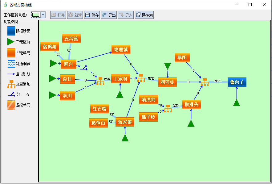 系統(tǒng)將集水區(qū)間、入流單元、預(yù)報(bào)斷面、虛擬斷面、河道等節(jié)點(diǎn)以不同的圖形概化成相應(yīng)的節(jié)點(diǎn)控件,通過拖拽各個(gè)節(jié)點(diǎn)控件,使用連接線可以構(gòu)造出流域中各節(jié)點(diǎn)間的關(guān)系,自動設(shè)置各節(jié)點(diǎn)的屬性選擇預(yù)報(bào)模型和河道匯流方式。