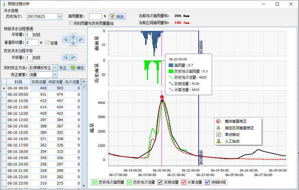預(yù)報(bào)作業(yè)時(shí)系統(tǒng)能夠根據(jù)配置的預(yù)報(bào)方案快速計(jì)算出初步結(jié)果。同時(shí),預(yù)報(bào)人員可參照歷史洪水、實(shí)時(shí)水雨情信息等,結(jié)合自身預(yù)報(bào)經(jīng)驗(yàn),對預(yù)報(bào)成果進(jìn)行校正。