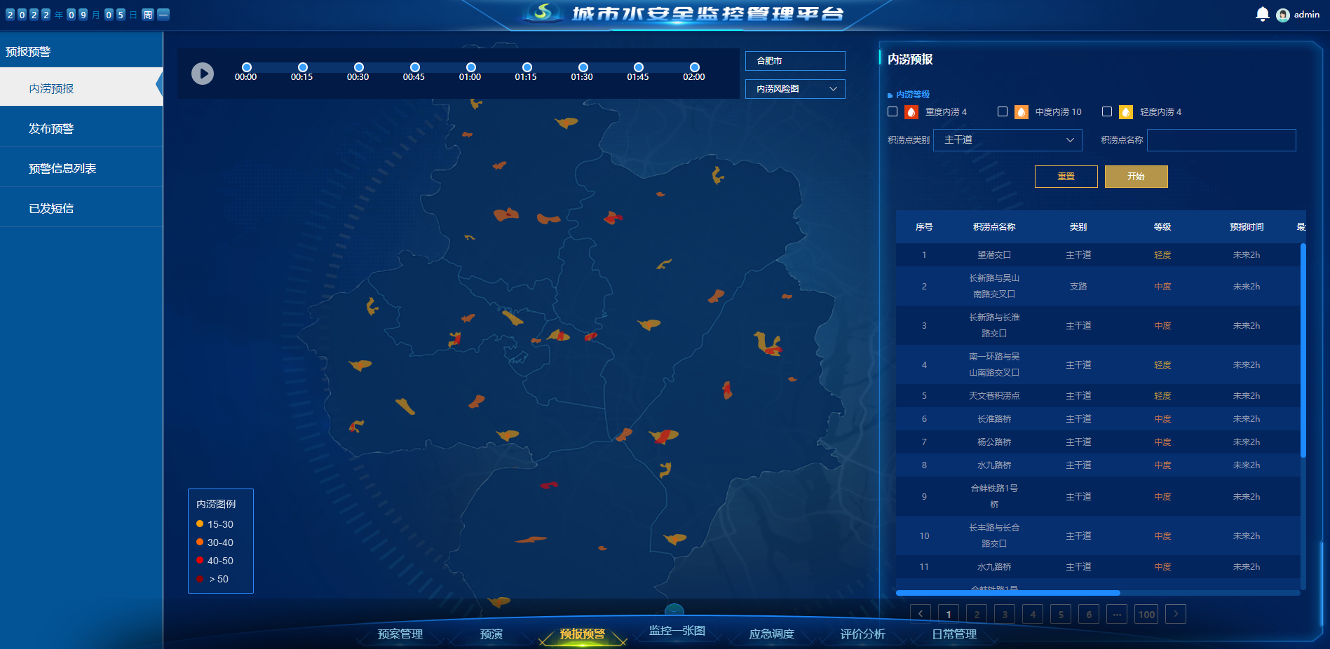 平臺(tái)將預(yù)報(bào)、預(yù)警、預(yù)演、預(yù)案體系融入智慧應(yīng)用,可快速推算出未來6小時(shí)的最大積水深度和淹沒面積,高效輔助內(nèi)澇風(fēng)險(xiǎn)早期識(shí)別和預(yù)警。