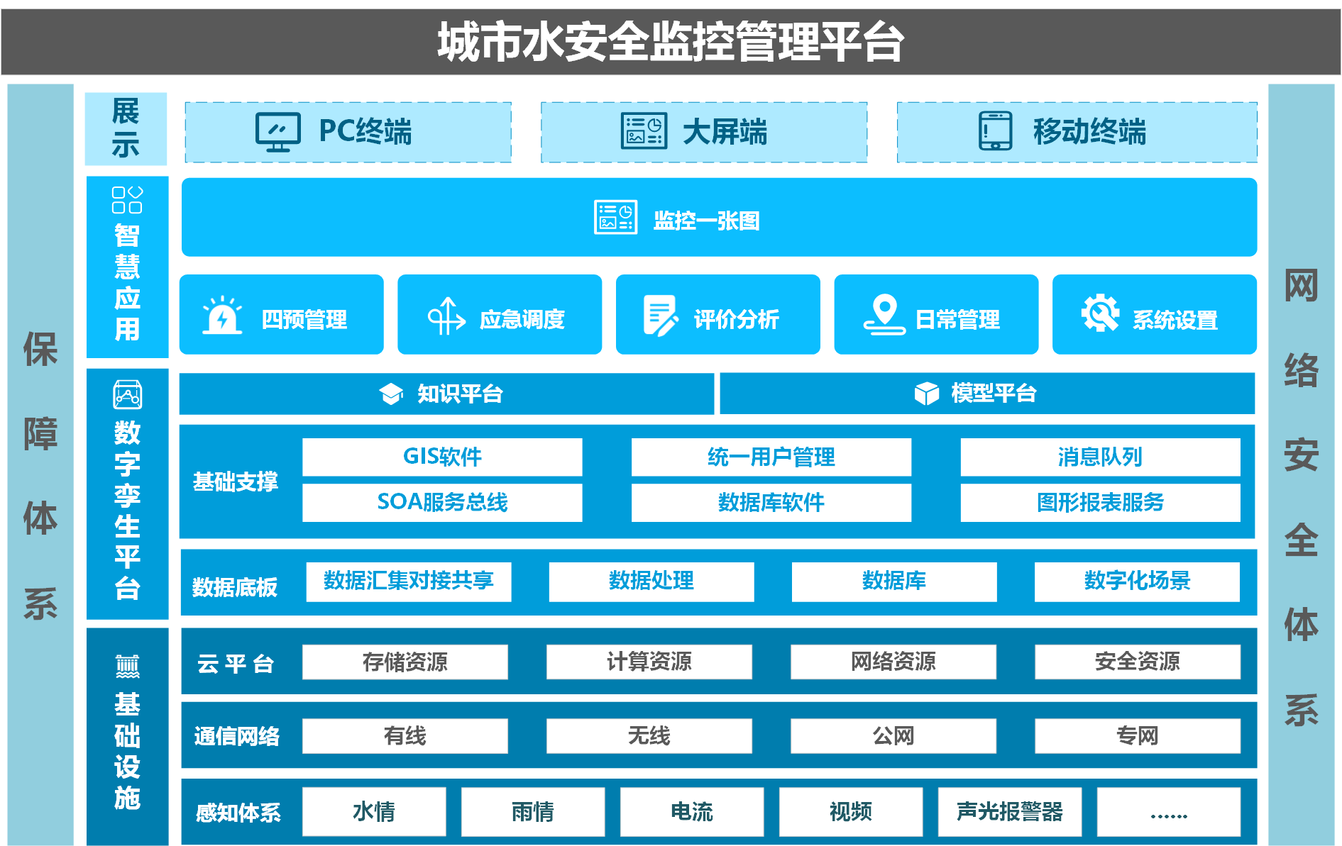 中水三立城市水安全監(jiān)控管理平臺(tái)通過城市水安全“風(fēng)險(xiǎn)可視”,實(shí)現(xiàn)全方位全天候的實(shí)時(shí)感知監(jiān)測(cè),第一時(shí)間發(fā)布預(yù)警信息,確保應(yīng)急決策指揮、問題處置的及時(shí)性和準(zhǔn)確性,做到“寧可十防九空,不可失防萬一”。