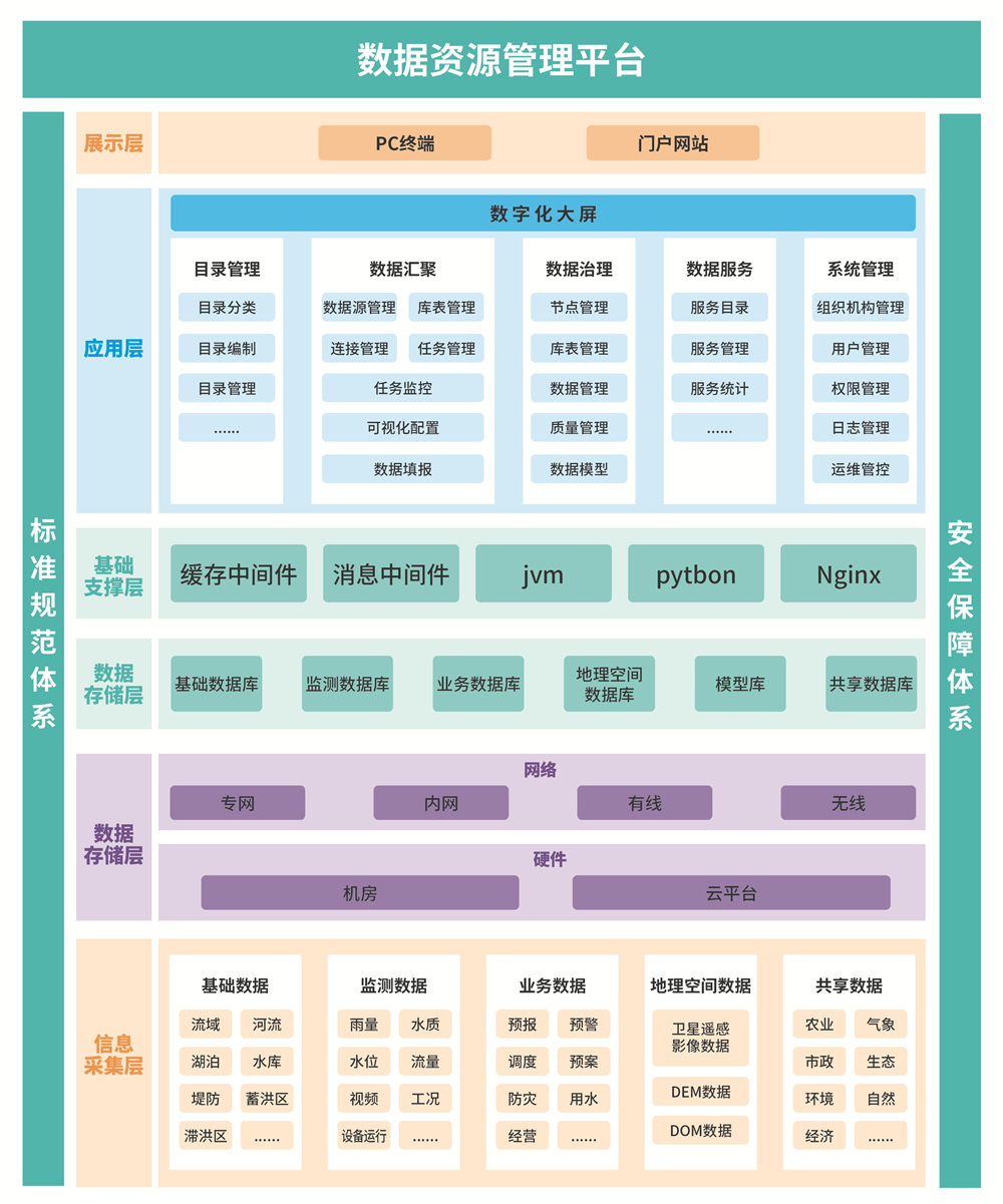 數(shù)據(jù)資源管理平臺(tái)為系統(tǒng)數(shù)據(jù)的集成接入提供統(tǒng)一的數(shù)據(jù)中心,實(shí)現(xiàn)數(shù)據(jù)的匯集加工、治理融合、共享交換。通過(guò)數(shù)據(jù)共享、開發(fā)和開放,實(shí)現(xiàn)對(duì)數(shù)據(jù)的深度分析、價(jià)值挖掘和合理應(yīng)用。最終實(shí)現(xiàn)了水利全要素?cái)?shù)字化映射。為流域防洪及水資源管理與調(diào)配等業(yè)務(wù)的“2+N”應(yīng)用提供支撐。